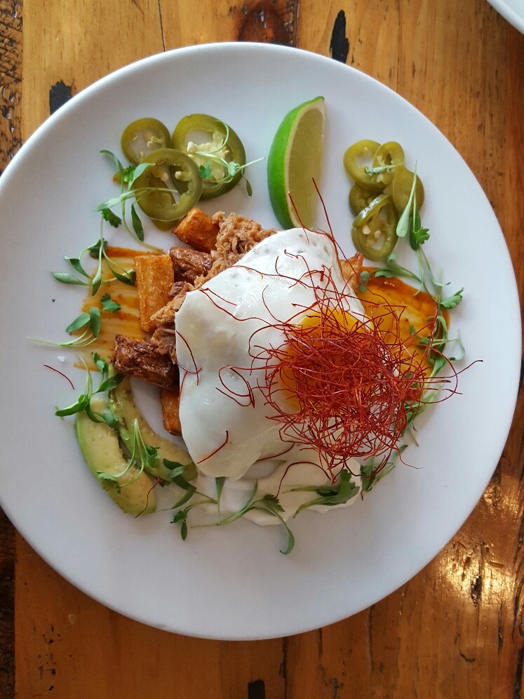 I had two dishes which consisted of the Huevos rancheros with braised pork, potatoes, fried egg and harissa and “Loaded” grits – pork belly, swiss chard, poached egg, K-mama sauce. I’ll start off with the Huevos Rancheros. I’ve always wanted to try this dish because of the many flavors and spices that are included with this dish. The braised pork wasn’t the highlight of this dish which I thought it would be, but it was the Harissa sauce. This sauce was amazing. It was spicy but the potatoes and the avacado added the perfect accompaniment to bring the whole dish together. It was beautifully presented and was definitely something that you can order by itself and not leave the restaurant hungry.