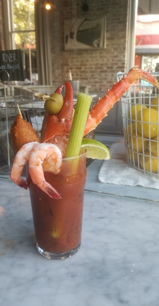 During my visit to Charleston I chose to stop at The Darling Oyster Bar because they had an amazing item on the menu that was to die for.  Yes, I’m being dramatic but I’ve never seen anything like this before.  Besides the aphrodisiacs that I ordered (Oysters and Clams), I decided to go for the Bloody Mary.  The Captain Bloody Mary consisted of King Crab, Lobster Claw, Pickled Shrimp, Celery, Hushpuppies, and Olives.  Talk about a “King’s Drink”.  (No Offense to women, I love you, too).  This drink is a dream come true.  Not only is the Bloody Mary spicy, salty, and flavorful, it’s also helpful if you have a hangover from the night before.  Don’t be fooled though, one too many of these will have you lusting for your mate at 2:13 p.m. on a Sunday afternoon.  The lobster, crab, and shrimp will help fill you up and are great finger foods to go with an awesome drink.