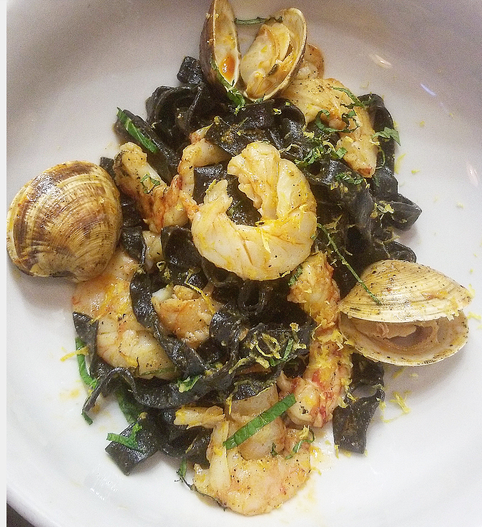The last dish that was ordered was my “safe dish”. Squid Ink pasta. It was a simple dish that consisted of Squid Ink Tagliatelle, Grilled Shrimp, and Clams. I chose this dish because the three other dishes were my wild card options. This dish however, was slightly disappointing. The squid ink pasta was a little tough, but the spices were too spicy. The shrimp was over-cooked and the clams were a bit mushy. Squid ink pasta are one of my favorite kind of pastas because it has a similar taste to a whole wheat pasta. I figured if I’m going to eat healthy, I’ll at least convince myself that I’m doing it with a dish that has a similar taste. Parsley was added to this dish. Why? I don’t know, but chef’s seem to love parsley.